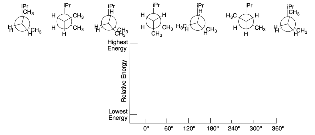 Disegnare un diagramma di energia qualitativo per il 2,3-dimetilpentano, relativo al legame C-3-C4 tra il gruppo metilenico (CH2) e quello metinico (CH). Le proiezioni di Newman sono riportate di seguito; etichettare con S le conformazioni sfalsate e con E quelle eclissate