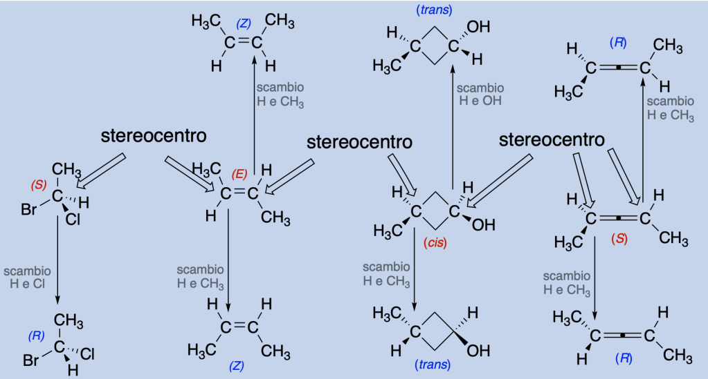 Isomeri configurazionali: sono stereoisomeri che, pur mantenendo la medesima connettività (i collegamenti tra i singoli atomi rimangono i medesimi), possono essere trasformati l’uno nell’altro solo rompendo legami chimici. Sono composti diversi e possono essere separati l’uno dall’altro. Gli isomeri configurazionali si dividono in: