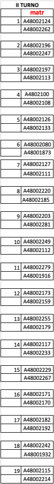 Gli studenti le cui matricole sono riportate nelle celle di colore verde hanno superato le prove intercorso e sono ammessi a sostenere l’esame orale nella sessione estiva 2023/24.