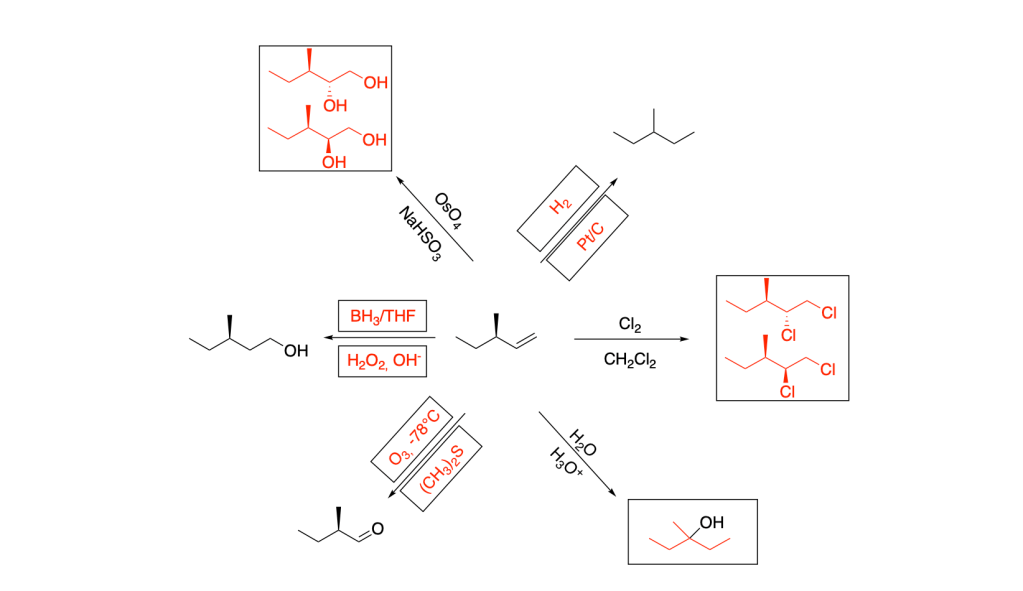 Scrivere il meccanismo delle reazioni elencate di seguito utilizzando l’(R)-6-fenil-1-metilcicloesene e qualsiasi altro reagente necessario. Per ogni reazione porre attenzione, dove appropriato, alla regioselettività, stereoselettività e alla stereospecificità. Assegnare, inoltre, il nome IUPAC ai prodotti di ogni reazione, specificandone la stereochimica e la relazione esistente tra loro (enantiomeri, diastereoisomeri, composto meso, ecc).