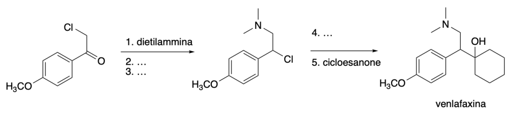 7. Proporre una sintesi per la venlafaxina a partire dal 2-cloro-4-metossifeniletanone, dalla dietilammina, dal cicloesanone e qualsiasi altro reagente necessario. (8 pt)