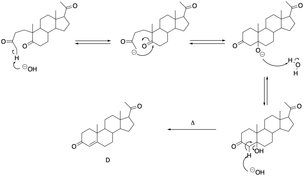 Indicare i reagenti per ciascuno stadio; scrivere la struttura dell’intermedio del primo stadio e proporre un meccanismo per la sua trasformazione in progesterone nello stadio 4.