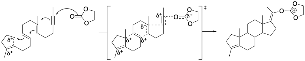 in seguito all’attacco dell’1,3-diossolan-2-one, questo intermedio va incontro ad una serie di ciclizzazioni concertate che portano alla formazione dell’intermedio B