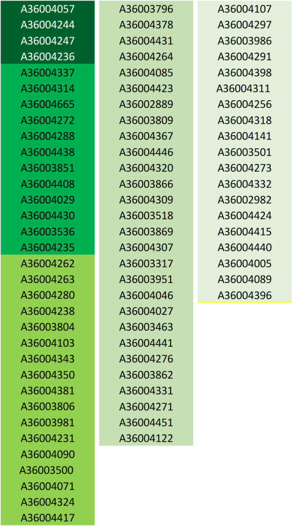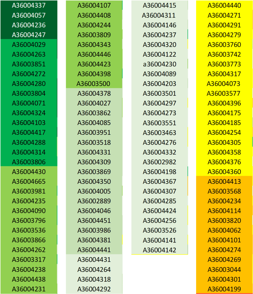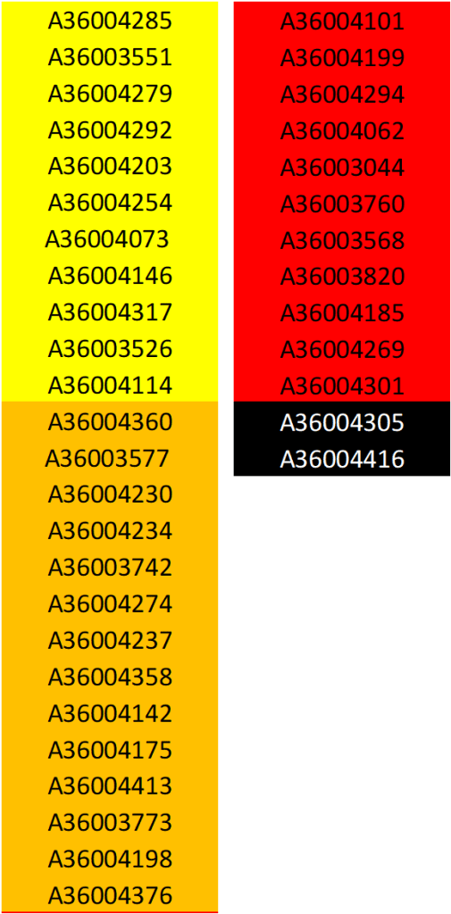 Gli studenti identificati dai colori giallo, arancione, rosso e nero hanno ottenuto una votazione insufficiente. Il rosso indica una insufficienza particolarmente grave (voto<12) e il nero indica una insufficienza gravissima (voto minore/uguale a 6… si ricorda che i voti sono espressi in trentesimi).