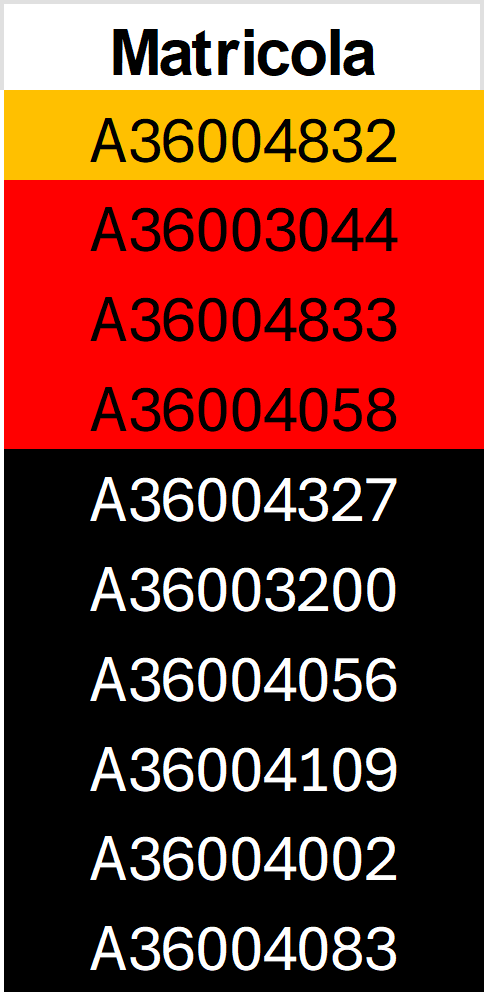 In arancione è indicata un’insufficienza grave (voto<15). In rosso e nero è indicata un’insufficienza gravissima (rosso voto inferiore a 12, nero inferiore/= a 6)