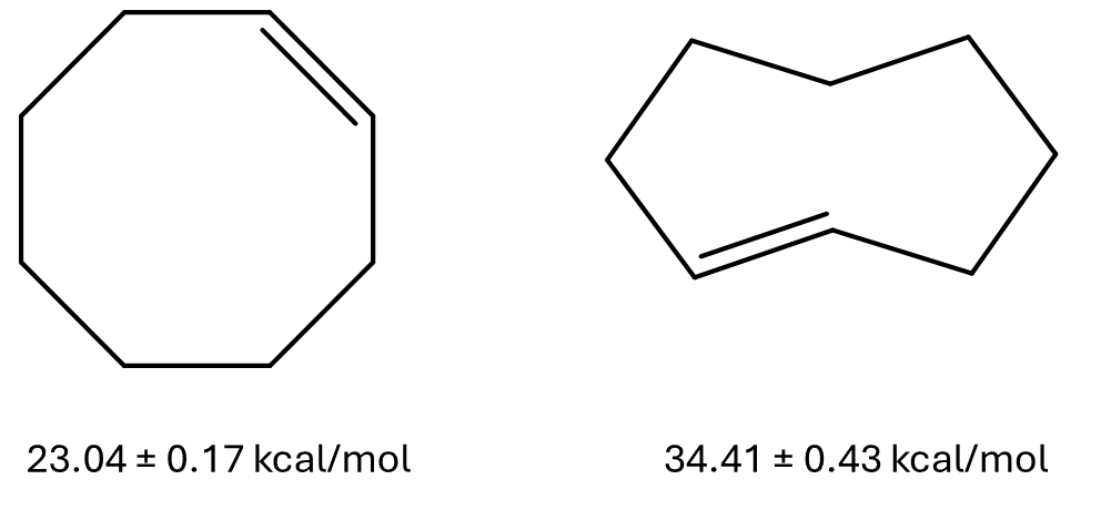 Nella figura qui sotto sono riportati i due isomeri geometrici del cicloottene con i rispettivi valori del calore di idrogenazione. Possiamo notare che questi due composti rappresentano un’eccezione rispetto a quanto abbiamo imparato circa la stabilità degli alcheni.