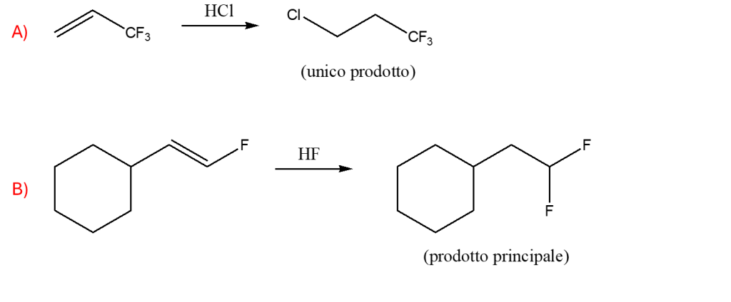 Sotto sono riportate due reazioni con i rispettivi prodotti (A e B) e con l’indicazione relativa al fatto che quelli indicati siano il prodotto principale o, nel caso di A, addirittura l’unico prodotto della reazione in questionw. Fornire una spiegazione plausibile per i prodotti osservati, utilizzando al massimo 30 parole per ciascun quesito.