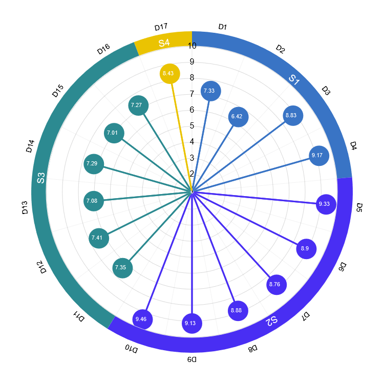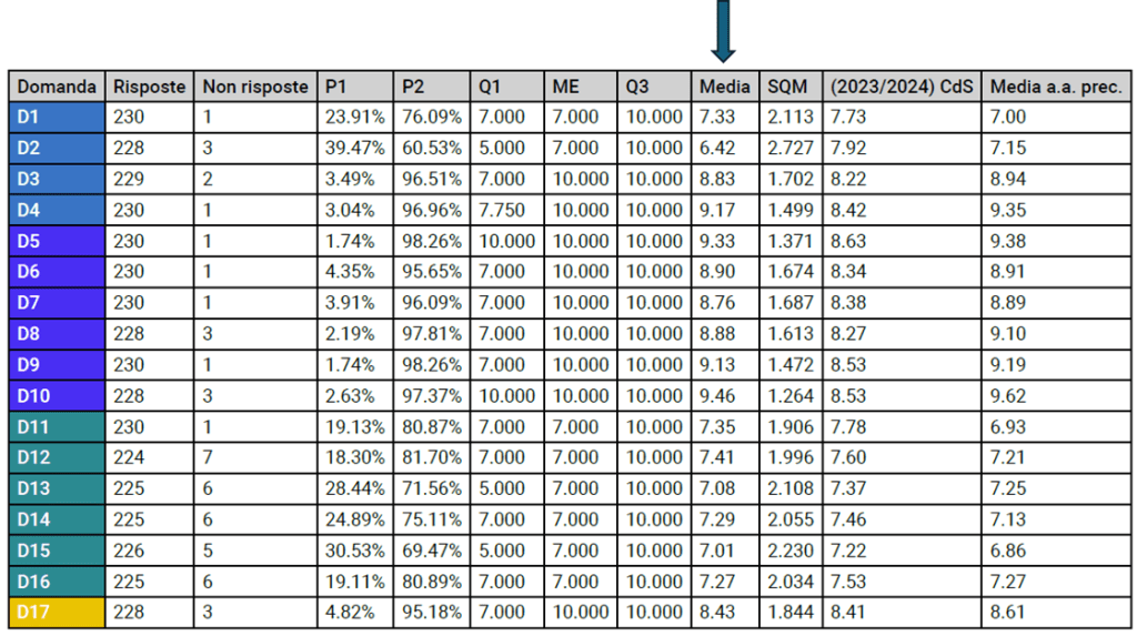 NB: i dati relativi al corso 2024-2025 sono quelli nella colonna “Media”. Per semplicità di consultazione, sotto è riportata di nuovo la tabella con le domande D1-D17