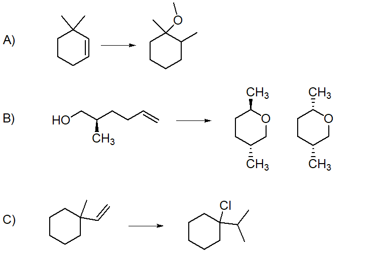 9) Partendo dall’opportuno alchene, illustrare il meccanismo di reazione della sintesi dei seguenti composti. Indicare eventuali altri prodotti fornendo per tutti il nome IUPAC completo di stereochimica.