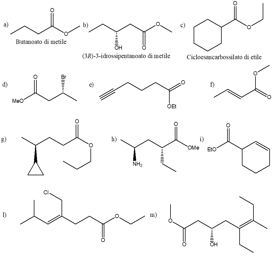 Come si costruisce il nome: alcanoato di alchile (dove “alcan” indica la radice del nome attribuita in base al numero di atomi di carbonio della catena principale, “alchile” fa invece riferimento alla catena -OR). Eventuali sostituenti vanno indicati utilizzano gli opportuni prefissi, mentre eventuali legami multipli vanno indicati utilizzando l’opportuno suffisso, sempre indicando la posizione. Le notazioni relative alla stereochimica vanno poste all’inizio del nome (vedi esempio b). Il carbonio carbonilico in questo caso è sempre 1 e quindi non va indicata la posizione. Per i composti ciclici (vedi esempio c), la presenza del gruppo funzionale si indica con il suffisso “carbossilato”. Per quanto riguarda l’indicazione del numero 1 nel nome, valgono le stesse regole viste per gli acidi carbossilici.