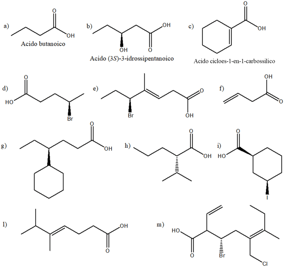 Come si costruisce il nome: acido alcanoico (dove “alcan” indica la radice del nome attribuita in base al numero di atomi di carbonio della catena principale). Eventuali sostituenti vanno indicati utilizzano gli opportuni prefissi, mentre eventuali legami multipli vanno indicati utilizzando l’opportuno suffisso, sempre indicando la posizione. Le notazioni relative alla stereochimica vanno poste dopo la parola “acido”. Il carbonio carbonilico, in questo caso, è sempre 1 e quindi non va indicata la posizione. Per i composti ciclici (vedi esempio c), nei quali il gruppo funzionale è direttamente legato al ciclo, la presenza del gruppo carbossilico si indica proprio con il suffisso “carbossilico” (acido cicloalcancarbossilico). Anche in questo caso la posizione 1 non va indicata se non sono presenti altri sostituenti (es. “acido cicloesancarbossilico”), ma va indicata se sono presenti altri sostituenti o gruppi funzionali (secondo l’ultimo aggiornamento IUPAC), come nell’esempio c.