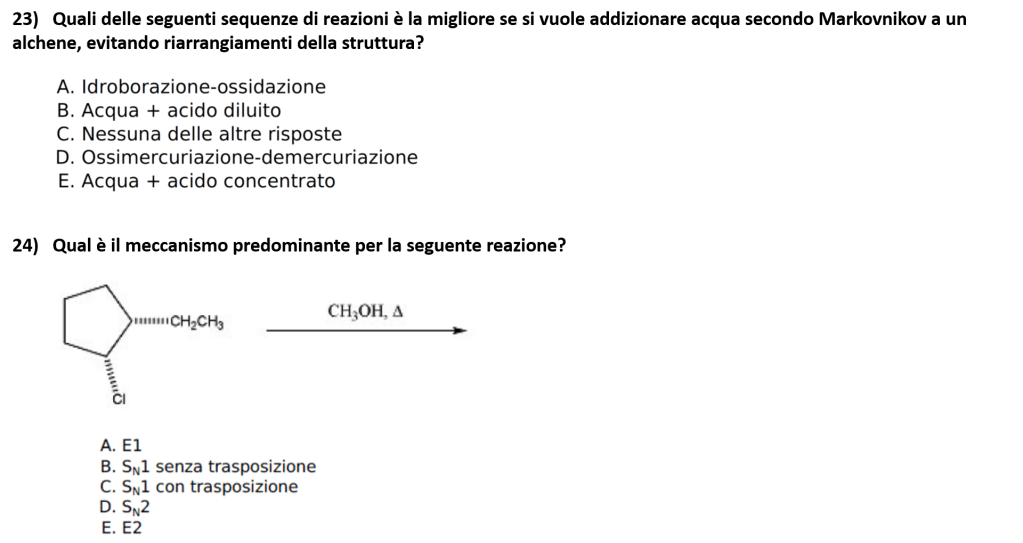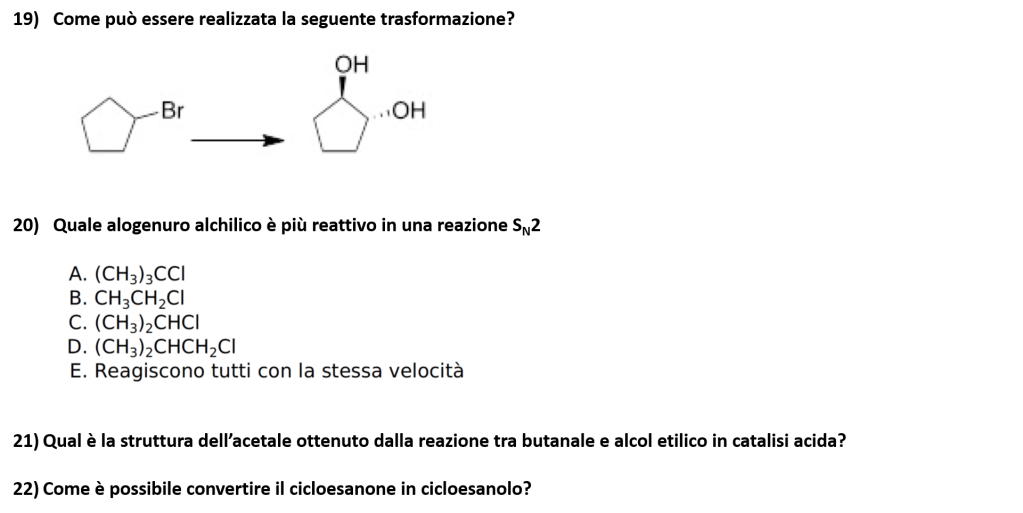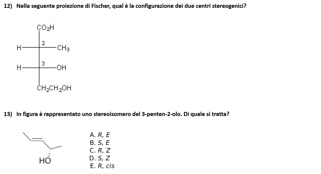 Alcune delle molecole elencate di seguito sono chirali, altre no. Scrivere le formule tridimensionali e quelle proiettive (Fischer) per gli enantiomeri delle molecole con C chirale, attribuendo a ciascun enantiomero la configurazione, secondo la notazione R,S: a) 1-cloropropano; b)1-bromo-1-cloropropano; c) bromocloroiodometano; d) 1-cloro-2- metilpropano; e) 2-cloro-2-metilpropano; f) 2-cloro-2-metilbutano; g) 2-bromobutano; h) 1-cloropentano; i) 2- cloropentano: l) 3-cloropentano.