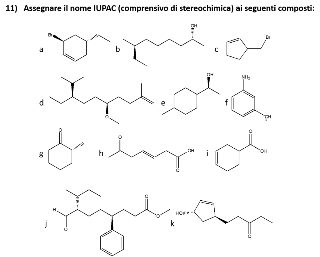 Quali tra i seguenti composti sono chirali? (indicare gli stereocentri); a) 2-metileptano; b) 3- metileptano; c) 4-metileptano; d) 1,1-dibromopropano; e) 1,3-dibromopropano; f) 1,2- dibromopropano; g) 2,3-dimetilpentano; h) metilcicloesano; i) 1,3-dimetilciclobutano;