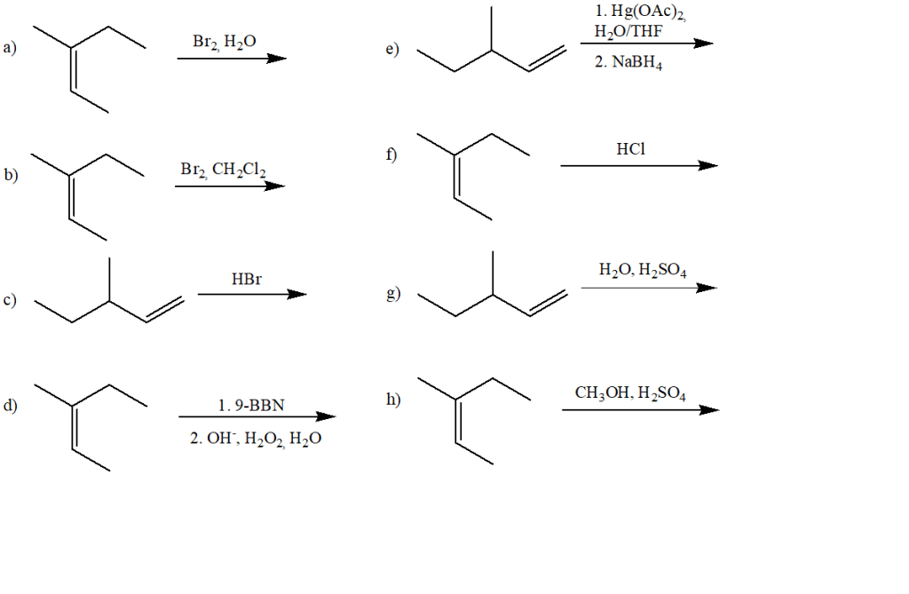 10) Scrivere il nome IUPAC (comprensivo di stereochimica) dei prodotti che si formano quando si fa reagire I) 2-metil-2-butene; II) (R)-3-metil-1-pentene; III) (E)-1-ciclobutil-1-butene con ciascuno dei seguenti reagenti. NB: mostrare il meccanismo per ciascuna reazione, indicando chiaramente anche la stereochimica!
