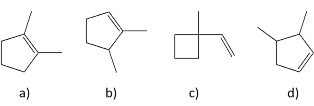 3) Quale/i dei seguenti alcheni darà come prodotto l’1-bromo-1,2-dimetilciclopentano come prodotto principale della reazione con HBr?
