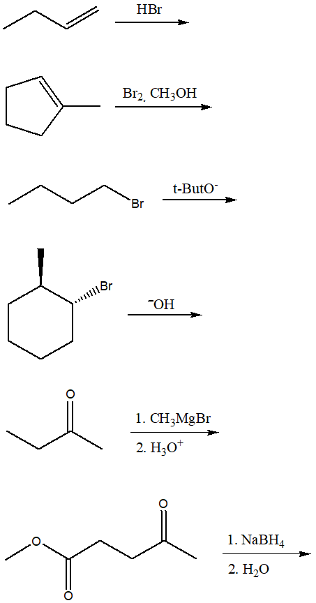 1) Scrivere il meccanismo di reazione e il prodotto (o i prodotti) principale delle seguenti reazioni. Indicare la stereochimica, se appropriato.