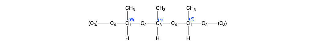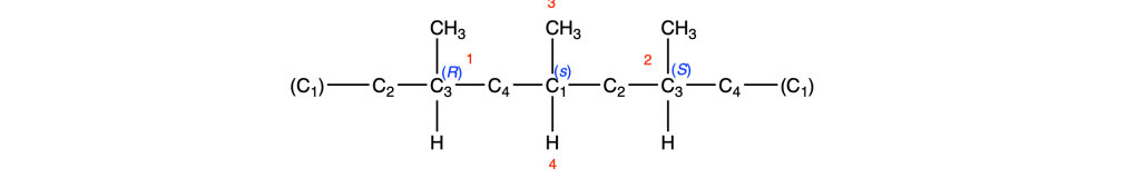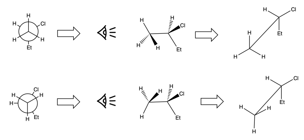 Per capire da quale alchene dobbiamo partire, trasformiamo questa proiezione di Fisher in una rappresentazione a cavalletto, sapendo che i sostituenti sulla linea verticale si trovano lontani dall’osservatore, mentre quelli sulla linea orizzontale sono rivolti verso l’osservatore: