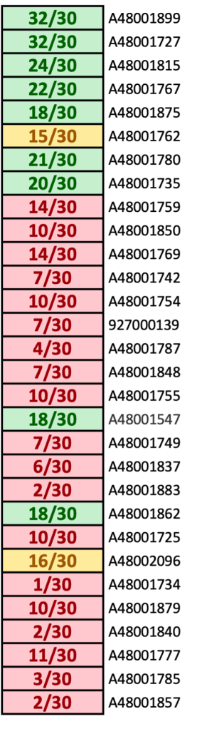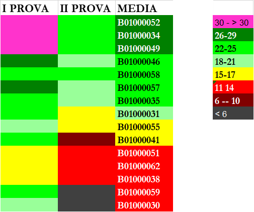 Avevo intenzione di riportare soltanto le ammissioni con le medie delle cinque prove ma, alla luce delle vostre recenti dimostrazioni dell’impegno profuso in questo corso e del rispetto che state attestando, ho deciso di riportare il voto in 30 che avete totalizzato ( o racimolato) in questa verifica, allo scopo di farvi rendere conto delle condizioni in cui vi trovate. Faccio presente che fino a questo momento ho fatto finta di non vedere o non considerare molti errori minori, ma d’ora in poi non lo farò più!