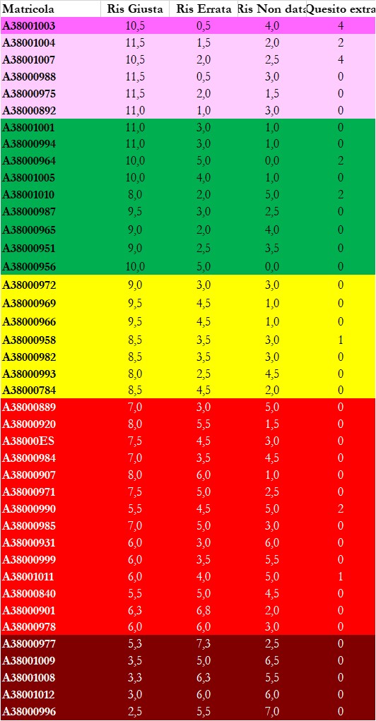Di seguito sono riportati i risultati della prova in oggetto. In verde sono indicati gli studenti che hanno superato la prova scritta.